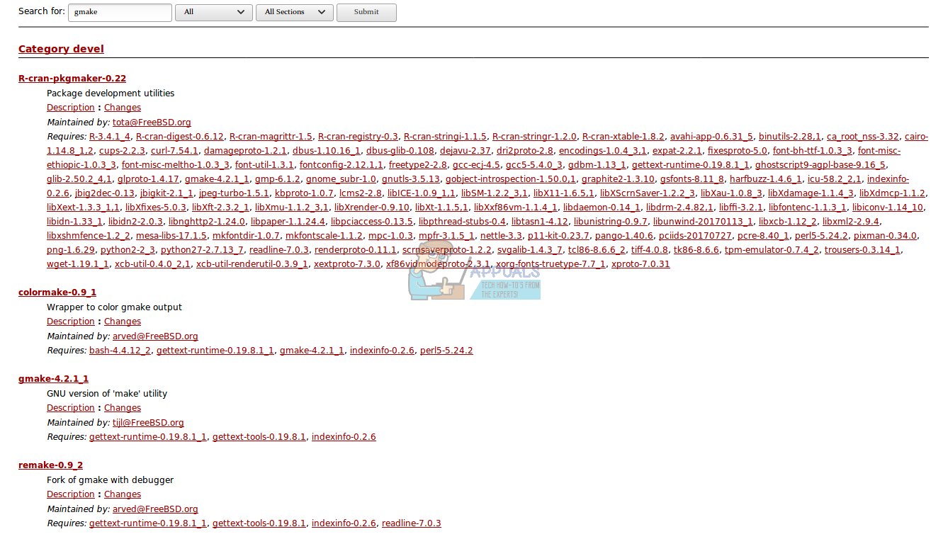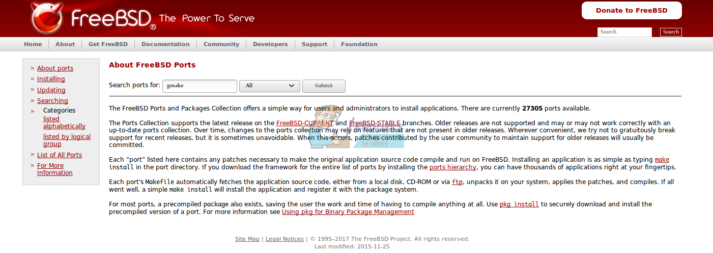 Введите https://www.freebsd.org/ports/ в строку URL и нажмите клавишу ввода. Во многих установках FreeBSD нет ничего, кроме терминала, но если у вас установлен порт w3m, вы можете набрать w3m https://www.freebsd.org/ports/ и нажмите Enter, чтобы сделать то же самое. В любом случае введите gmake в поле поиска и нажмите Enter, затем прокрутите вниз.