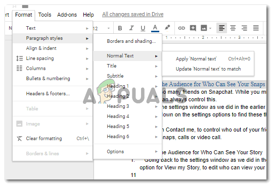Форматирование выбранной строки было изменено - Теперь, чтобы реализовать все изменения, которые вы внесли в эту строку, в качестве формата для всего документа, вам нужно оставить эту строку выбранной. После того, как он выбран, вы должны нажать на вкладку «Формат», которая находится на верхней панели инструментов для Документов Google. Появится раскрывающийся список с различными вариантами форматирования.