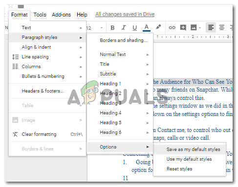 Вот так будет выглядеть документ. Но этот параметр только для этого текущего документа, который открыт. - Чтобы этот формат стал настройками по умолчанию для ваших Документов Google, чтобы вам не приходилось каждый раз менять настройки, вам нужно вернуться к формату, а затем к стилям абзаца. В этом раскрывающемся списке в конце списка вы увидите вкладку «Параметры». В ту минуту, когда вы наведете курсор на «Параметры», вы увидите вкладку «Сохранить как стили по умолчанию». Это сделает текущие настройки, заданные вами, форматированием по умолчанию для всех документов, которые вы будете выполнять в Документах Google с этого момента.