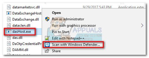 Если исполняемый файл находится в Windows / System32, Вы можете быть уверены, что не имеете дело с замаскированным вредоносным ПО. Если вы все еще настроены скептически, вы также можете запустить проверку на вирусы, щелкнув правой кнопкой мыши DasHost.exe и выбирая Сканирование с помощью Защитника Windows.