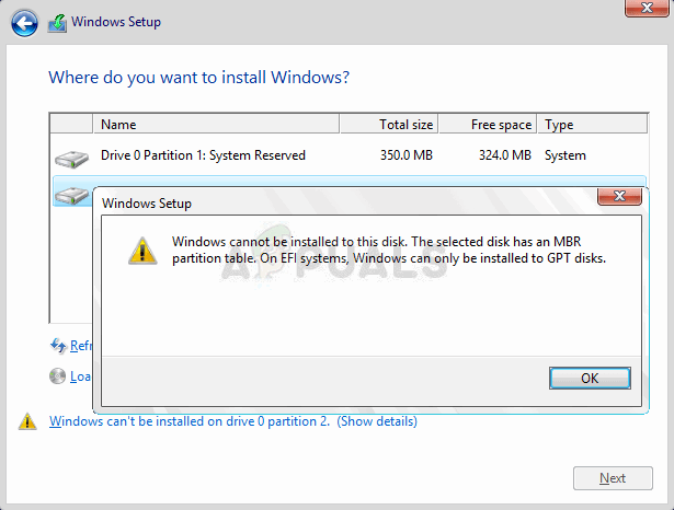 «Windows не может быть установлена на этот диск. выбранный диск имеет таблицу разделов MBR. В системе EFI Windows может быть установлена только на GPT-диски ».
