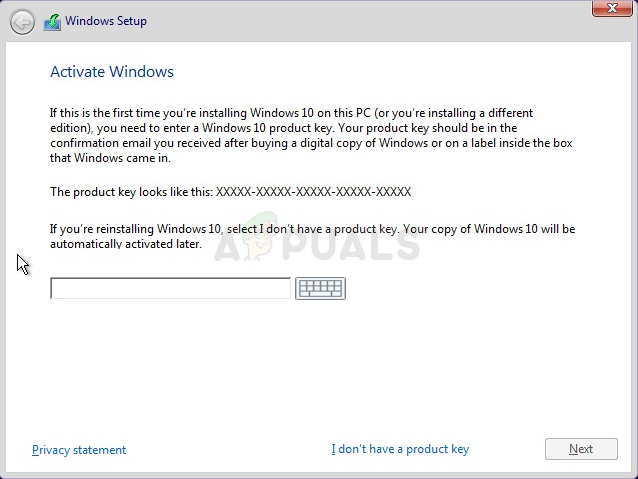- Если вы никогда ранее не устанавливали Windows 10 на этот компьютер, вы увидите экран активации Windows. Введите ключ Windows 10 здесь. Если у вас его нет, но у вас есть действительный ключ 7, 8 или 8.1, введите его здесь. Вы также можете пропустить эту часть и ввести ключ после завершения установки.