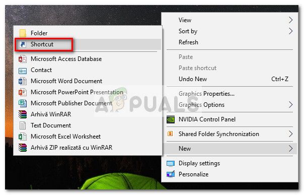 - Щелкните правой кнопкой мыши в любом месте на свободном месте (на рабочем столе или в папке) и выберите New> Ярлык.