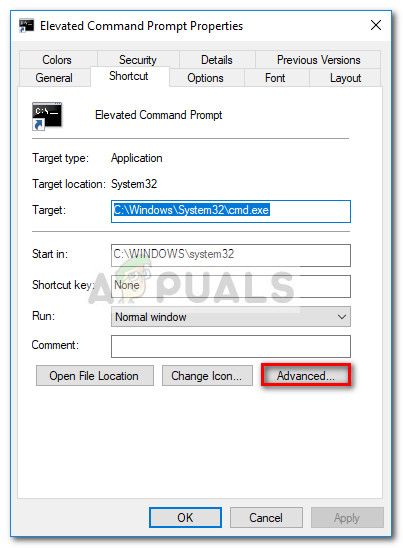 - Затем щелкните правой кнопкой мыши по вновь созданному ярлыку и выберите свойства. Затем перейдите к кратчайший путь и нажмите продвинутый кнопка.