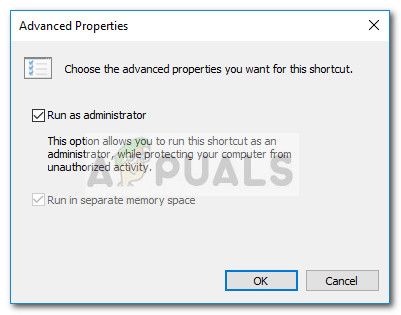 - В окне «Дополнительные свойства» установите флажок «Запуск от имени администратора» и нажмите Хорошо. Наконец, нажмите на Применять сохранить изменения.