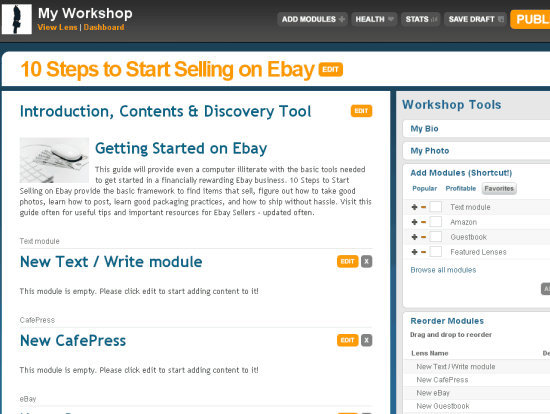Потенциал для создания очень классного контента с Squidoo очень хорош. Выкладывание страниц — это не ракетостроение, а интерфейс настолько прост, насколько это возможно для веб-дизайна. Вы просто нажимаете на модули, которые хотите редактировать, или удаляете те, которые не хотите. Когда вы закончите, нажмите «Опубликовать», и ваша страница будет готова.