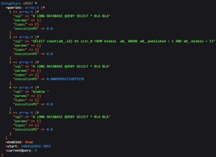 Помимо стандартных устройств Symfony devtools, которые предоставляют подробную информацию о ваших запросах, вы можете получить эту информацию, чтобы показать ее своим пользователям. Внутри пользовательского объекта DebugStack вы найдете информацию, такую как время в миллисекундах, которое потребовало выполнения запроса, сам запрос SQL и некоторые другие параметры.