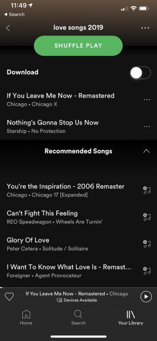 Вы найдете свой новый микстейп под списками воспроизведения в вашей библиотеке. В следующем примере (например, для Spotify) я создал плейлист под названием Love Songs 2019, который в настоящее время включает две песни: