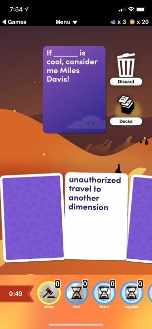 Существует более 4000 карточек ответов и 800 карточек с вопросами, чтобы всегда было интересно. Вы можете играть с близкими друзьями на собрании или даже в другое время через тексты, Twitter или Facebook. Случайный блиц-режим позволит вам сразу играть с незнакомцами.