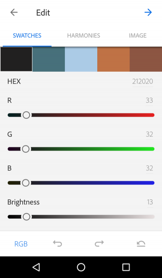 Изображение, последняя категория, позволит вам пересмотреть или перенастроить исходную цветовую палитру, используя исходное эталонное изображение. Ваша цветовая тема будет сохранена непосредственно в вашей библиотеке цветов Adobe для последующего использования.