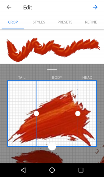Инструменты для обрезки разделены на три части: хвост, тело и голова. Поскольку вы создаете собственную кисть, эти три параметра описывают ориентацию вашей кисти. Исправьте масштаб вашего удара и ориентацию. Вы увидите пространство предварительного просмотра над кадрированием, которое позволит вам нарисовать простую форму, используя обрезанный штрих.