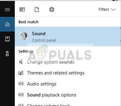 - Нажмите Windows + S, введите «звук”В диалоговом окне и откройте приложение панели управления, которое выходит. Кроме того, вы можете перейти к панели управления самостоятельно и открыть настройки.