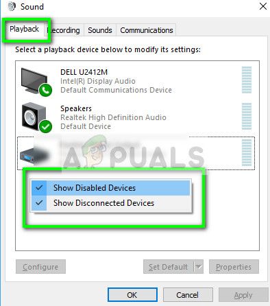 - Теперь нажмите на Вкладка воспроизведения, щелкните правой кнопкой мыши на любом пустом месте и убедитесь, что оба варианта проверено т.е. «Показать отключенные устройства» а также «Показать отключенные устройства».