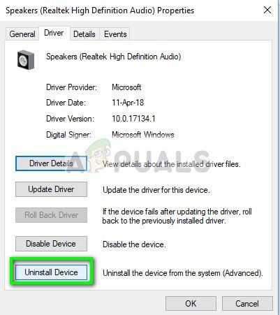 - Нажмите на Вкладка «Драйвер» присутствует в верхней части экрана. Здесь вы увидите вариант деинсталляция ваш звуковой драйвер. Нажмите на это.