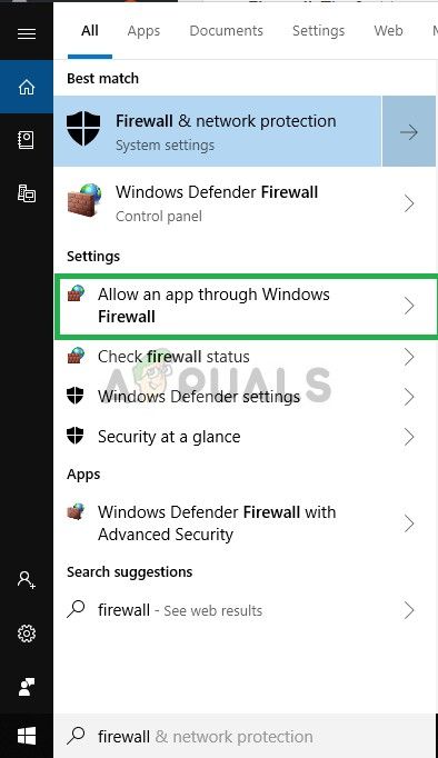 - Введите «Брандмауэр«В строке поиска и нажмите»Разрешить приложение через брандмауэрВариант.