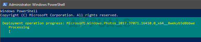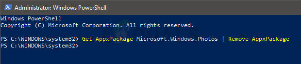 - Тип Get-AppxPackage Microsoft.Windows.Photos | Remove-AppxPackage а также нажмите Ввод
