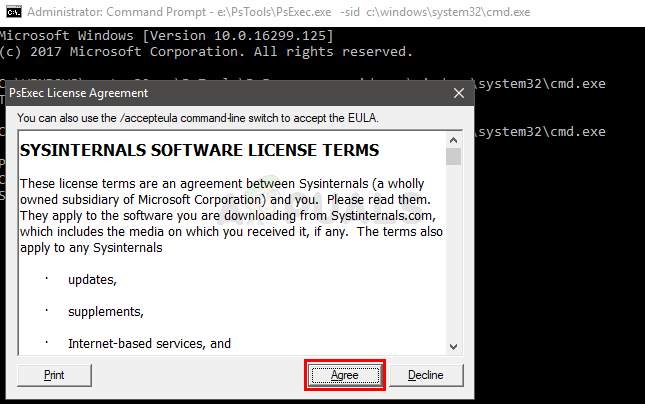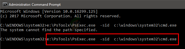 - Тип PsExec.exe -sid c: \ windows \ system32 \ cmd.exe и нажмите Войти. Замечания: Заменить на фактический адрес. Это должно быть место, где вы только что извлекли содержимое загруженного файла. Например, я распаковал файлы в e: \ pstool, поэтому мое местоположение будет выглядеть так e: \ PsTools \ PsExec.exe -sid c: \ windows \ system32 \ cmd.exe