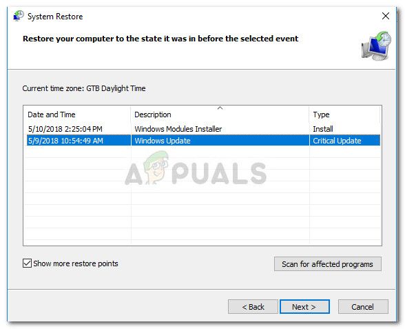 Некоторым пользователям удалось решить проблему после использования предыдущей точки восстановления системы, чтобы вернуть компьютер в состояние, в котором он функционировал должным образом.