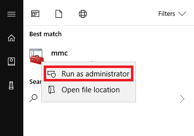 - Нажмите на кнопку Пуск (или нажмите Ключ победы) и введите «ММСЧтобы найти Консоль управления Microsoft. Затем щелкните правой кнопкой мыши на Консоль управления Microsoft и нажмите на Запустить от имени администратора.