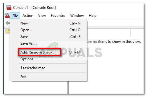 - в Консоль управления Microsoft, перейдите на ленту сверху, нажмите на файл а затем выберите Добавить / Удалить Страпон…