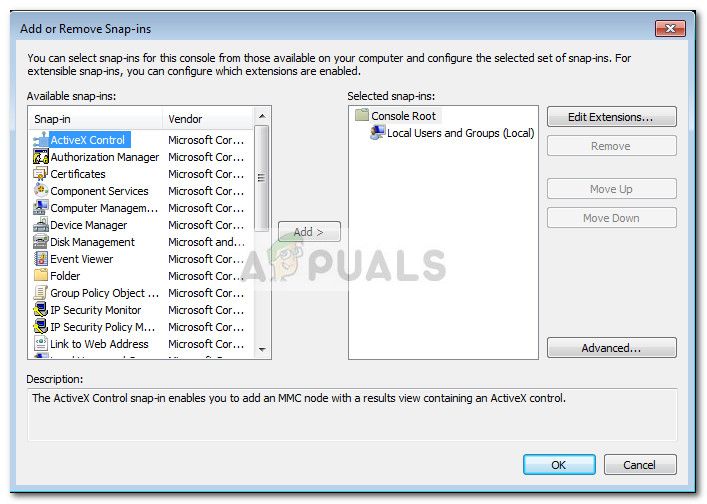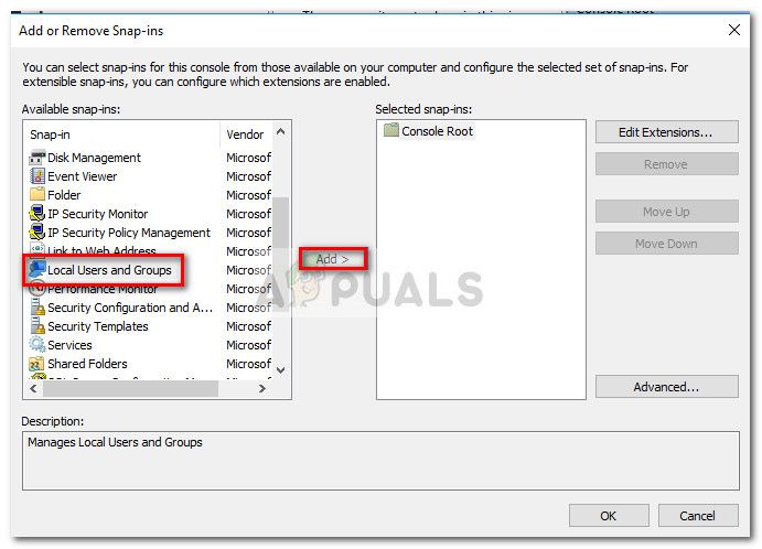- в Добавить или удалить оснастки окно, нажмите на Локальные пользователи и группы чтобы выбрать его, затем нажмите добавлять кнопка.