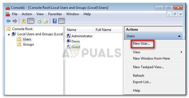 - Затем дважды нажмите на Локальные пользователи и группы (локальные), затем дважды щелкните по пользователей. Затем используйте меню действий с правой стороны и нажмите Новый пользователь.