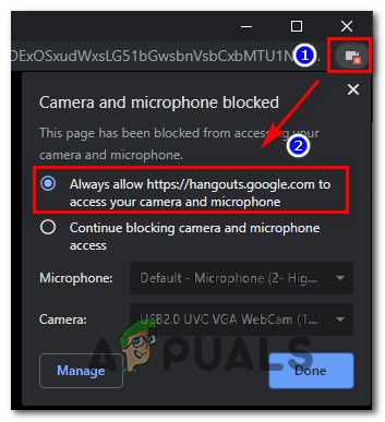 После того, как вы щелкнете по всплывающему значку, выберите переключатель, связанный с Всегда разрешать * URL * доступ к вашей камере и микрофону. Затем убедитесь, что выбрана правильная камера, прежде чем нажимать Готово кнопка.
