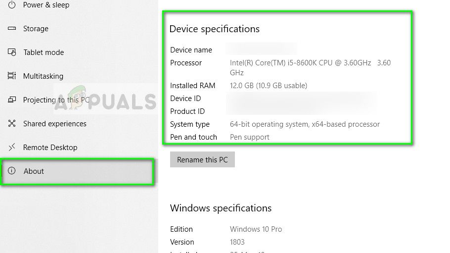 - Теперь нажмите Около из левой панели навигации. Здесь, под Спецификациями устройства, вы найдете обзор вашего компьютера. Имя устройства, процессор, оперативная память и т. Д. Будут перечислены. В этом случае объем оперативной памяти составляет 12 ГБ, а процессор — i5-8600k (с разгоном включен) с каждым потоком на частоте 3,60 ГГц.